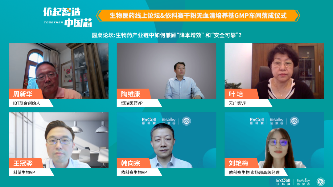 圓桌論壇環(huán)節(jié),各位嘉賓都是行業(yè)領(lǐng)域內(nèi)的佼佼者,此次圓桌可謂是行業(yè)大拿們一次智慧碰撞。本環(huán)節(jié)由依科賽生物市場高級經(jīng)理劉艷梅主持,參與討論的為IBT聯(lián)合創(chuàng)始人周新華、恒瑞醫(yī)藥VP 陶維康、天廣實(shí)VP 葉培、科望生物VP 王冠驊、依科賽生物VP 韓向宗5位嘉賓,他們以“生物藥產(chǎn)業(yè)鏈中如何兼顧“降本增效” 和“安全可靠”?為主題進(jìn)行探討。期間,與會嘉賓均肯定了生物醫(yī)藥領(lǐng)域國產(chǎn)化的必然性及降本增效的迫切性,培養(yǎng)基在生物醫(yī)藥生產(chǎn)中“降本增效”的關(guān)鍵地位以及生物醫(yī)藥上下游分工合作,協(xié)同發(fā)展的重要性。嘉賓們各抒己見,妙語頻出、精彩連連,觀點(diǎn)意見更是掀起一場場頭腦風(fēng)暴,引人深思。