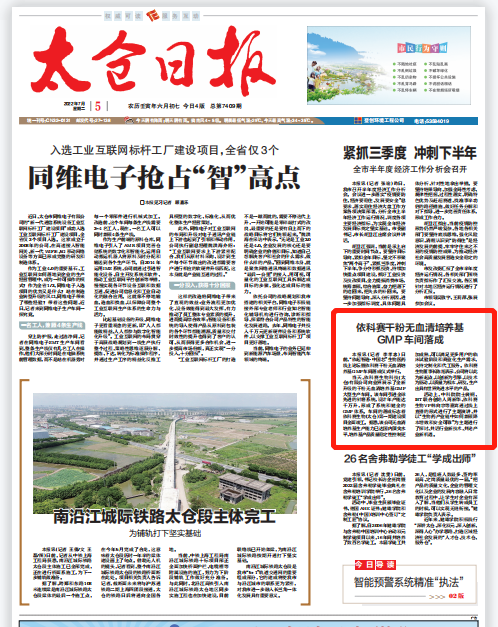 2022年7月5日,《太倉日報》刊登新聞《依科賽干粉無血清培養基 GMP車間落成》,對公司舉辦的“依起智造·中國芯”生物醫藥線上論壇暨依科賽干粉無血清培養基GMP車間落成儀式進行了重點報道。